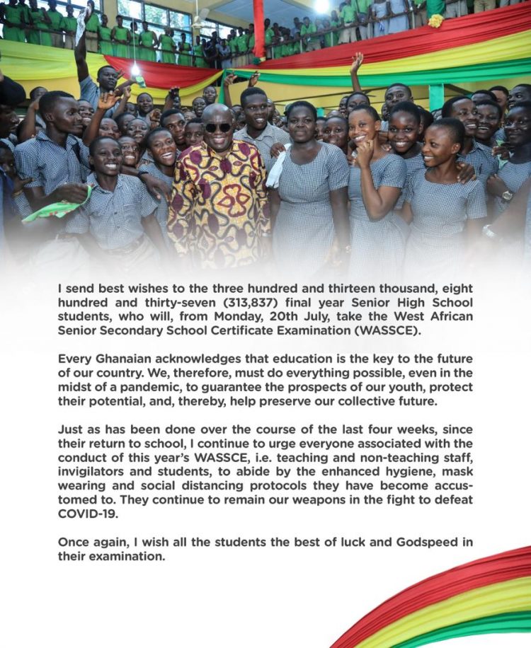 President Addo Dankwa Akufo-Addo has sent his well wishes to the over 300,000 students that will be sitting for the 2020 West African Senior Secondary School Certificate Examination (WASSCE), starting on Monday, July 20, 2020.