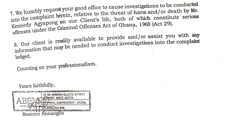 Sammy Gyamfi’s lawyers said they thus “feel compelled to formally write and lodge a complaint against Mr. Kennedy Agyapong” to protect their client’s life.