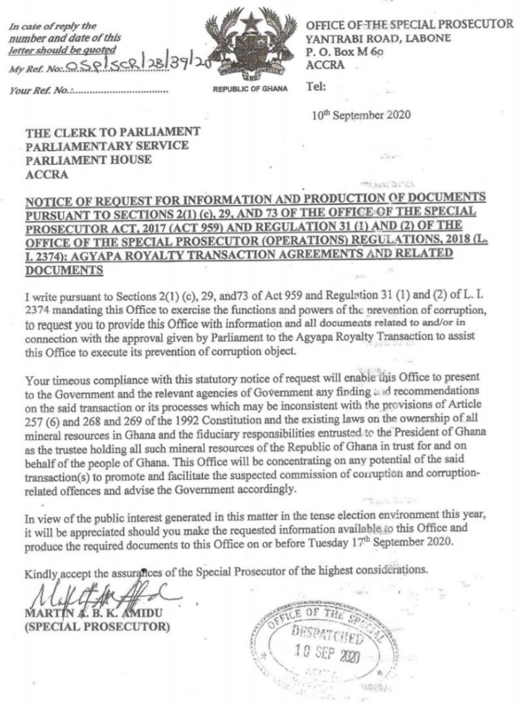 “I write in pursuant to Sections 2(1) c, 29 and 73 of Act 959 and Regulation 31 (1) and (2) of L. I. 2374 mandates the Office to exercise the functions and powers of the prevention of corruption, to request you to provide this office with information and all documents related to and/or in connection with the approval given by parliament to the Agyapa Royalty Transaction to assist this office to execute its prevention of corruption object,” the letter from the Special Prosecutor to parliament said.