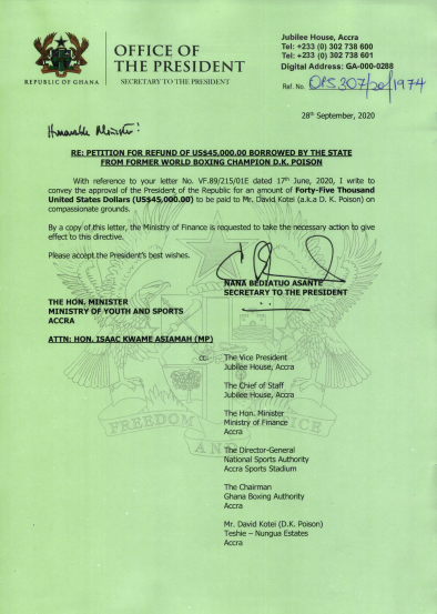 “Ï write to convey the approval of the President of the Republic for an amount of forty-five Thousand United States Dollars (US$ 45,000) to be paid to Mr. David Kotei (a.k.a DK Poison) on compassionate grounds.