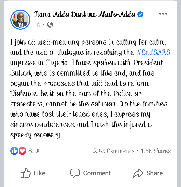 2 thoughts on “EndSARS Protests: Akufo-Addo calls Buhari to end impasse”