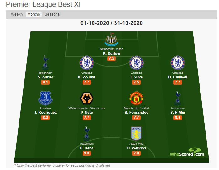 Stats website WhoScored’s team for October has a back 4 featuring 3 Chelsea players – Kurt Zouma, Thiago Silva and Ben Chilwell.