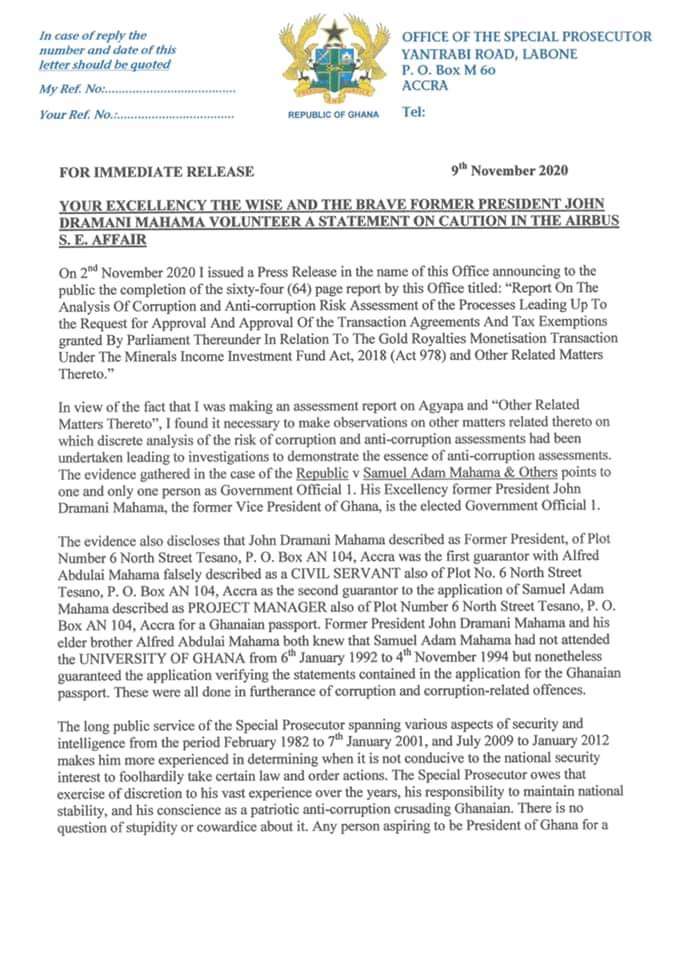 A press release issued by the Office Of Special Prosecutor however defends the inclusion of the Airbus issue in the Agyapa report. The SP in the release insists the NDC Candidate is Government Official 1.