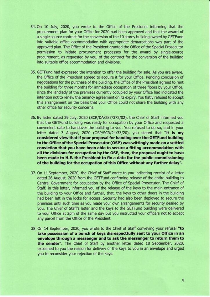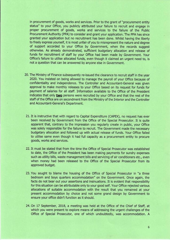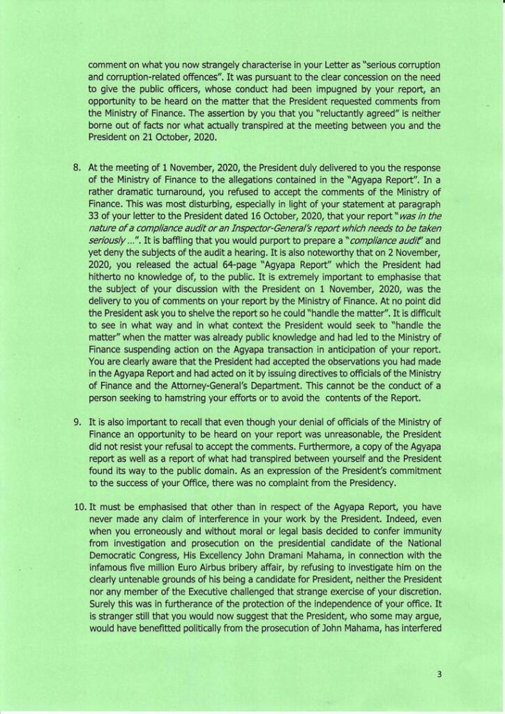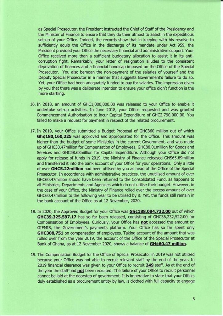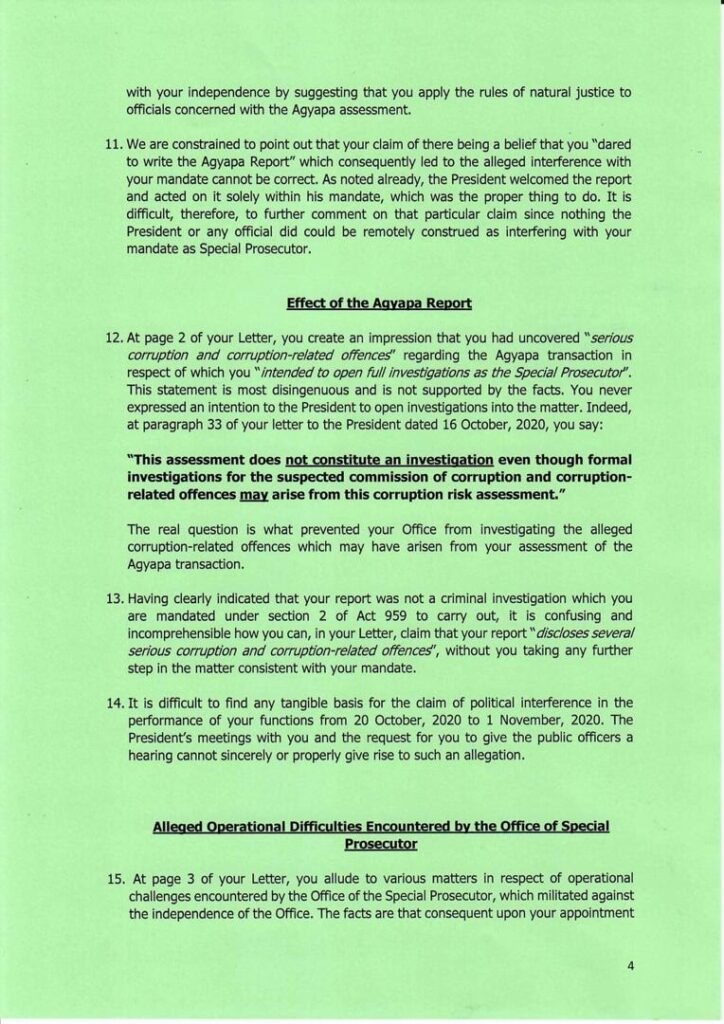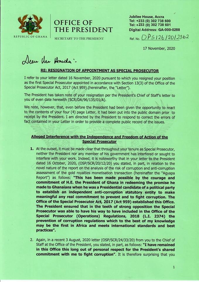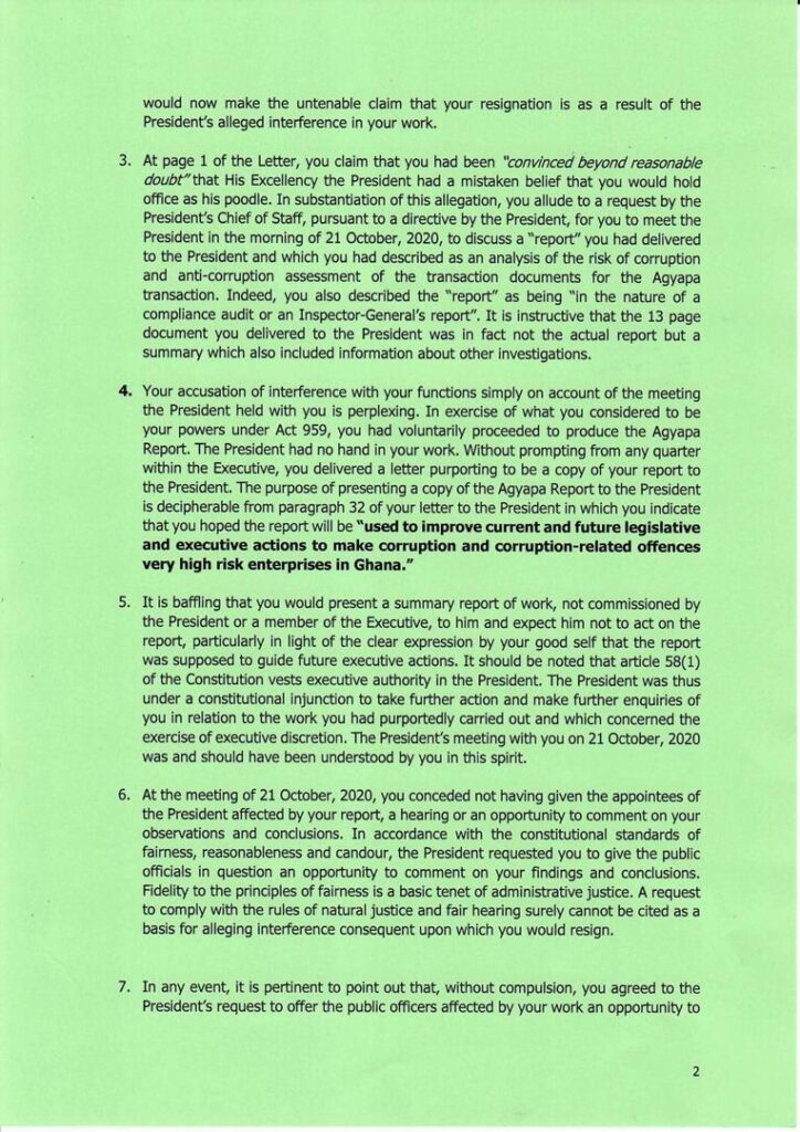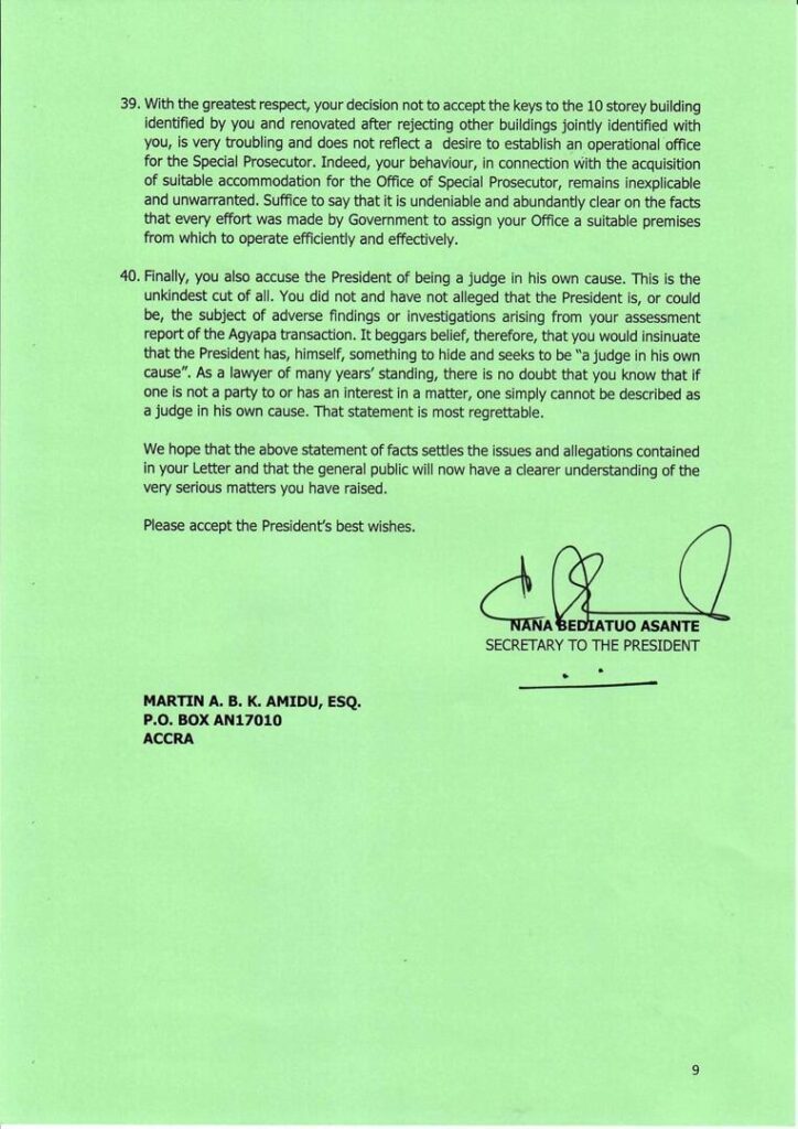 According to the President, the allegations by Mr. Amidu that there was “interference” following his submission of the Agyapa Royalties report to the President, are surprising since the former SP had stated in an earlier letter that he had remained in office due to the President’s shared commitment to the fight against corruption.
