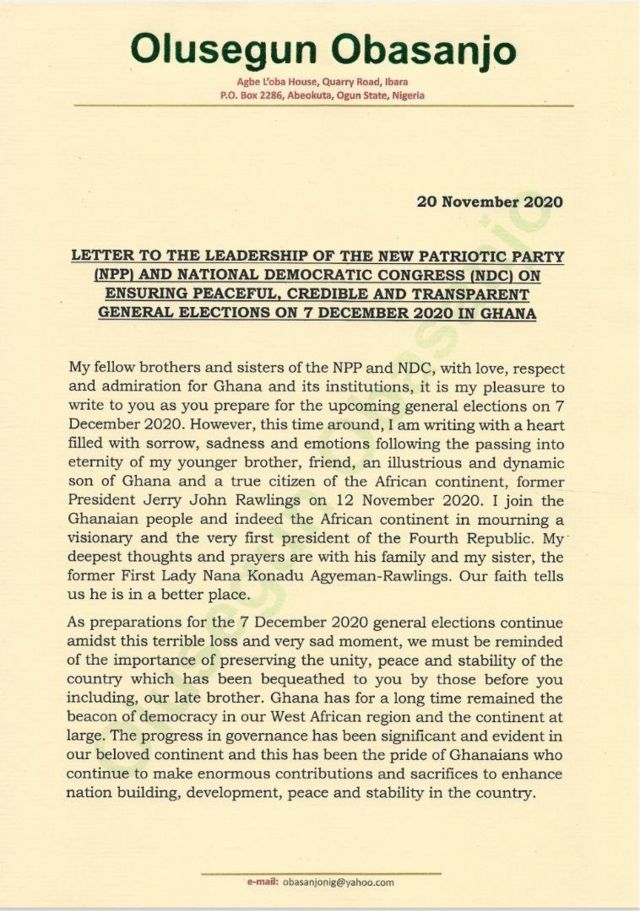 In a letter addressed to the governing New Patriotic Party (NPP) and the opposition National Democratic Congress (NDC), Mr. Obasanjo urged the two leaders to be mindful of the importance of preserving the unity, peace, and stability of the country which has been bequeathed to them by those before them, including the late former President Jerry John Rawlings.