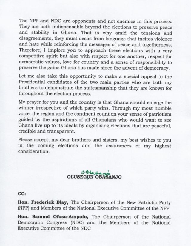 Nigeria’s former President Chief Olusegun Matthew Okikiola Aremu Obasanjo has called on Ghana’s presidential candidates to ensure peace and unity ahead of the December 7 polls.