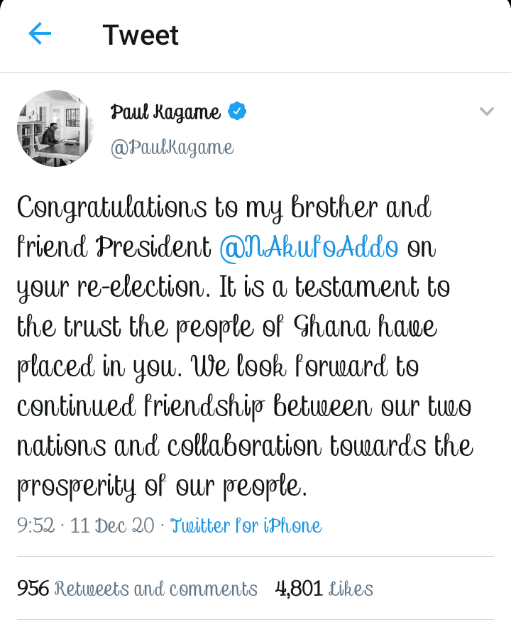 On his part, Rwanda’s President, Paul Kagame said the victory of Nana Addo is a testament to the trust of the Ghanaian people.