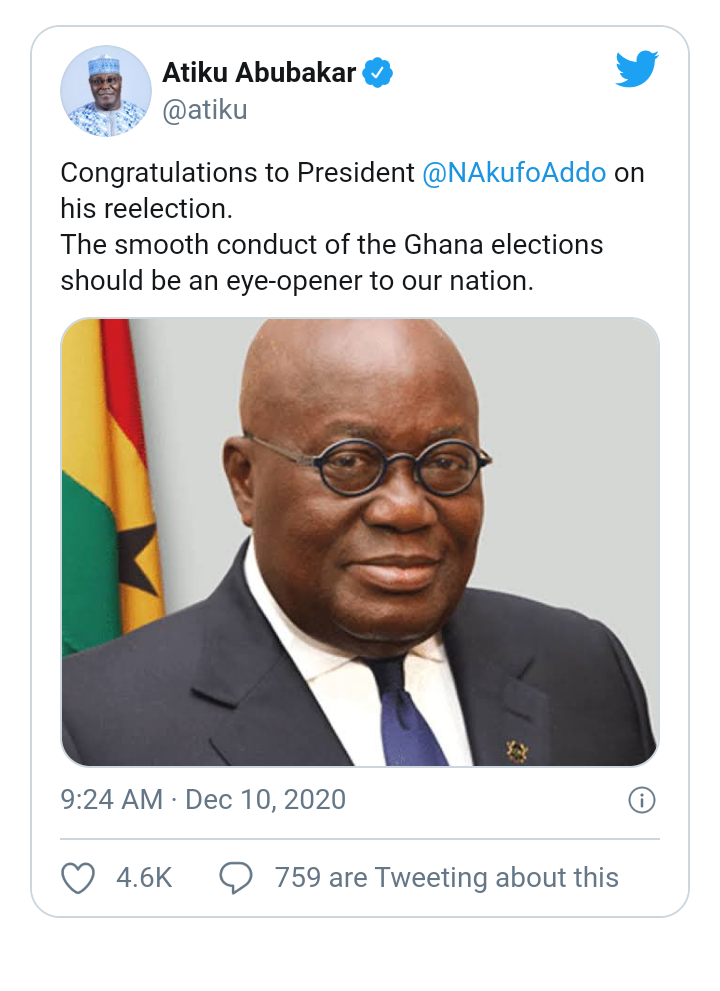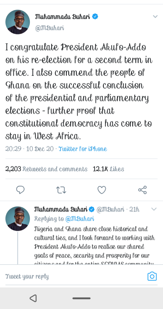 Nigeria’s President, Muhammadu Buhari in a tweet wrote: “I congratulate President Akufo-Addo on his re-election for a second term in office. I also commend the people of Ghana on the successful conclusion of the presidential and parliamentary elections – further proof that constitutional democracy has come to stay in West Africa.”