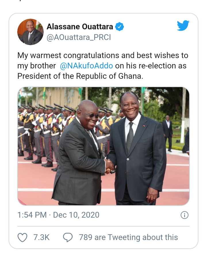 Ivorian leader, Alassane Ouattara who described Nana Akufo-Addo as a brother tweeted that “my warmest congratulations and best wishes to my brother Nana Akufo-Addo on his re-election as President of the Republic of Ghana.”
