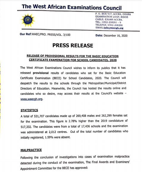 “The West African Examination Council wishes to inform its publics that it has released provisional results of candidates who sat for the Basic Education Certificate Examination (BECE) for school candidates, 2020.”