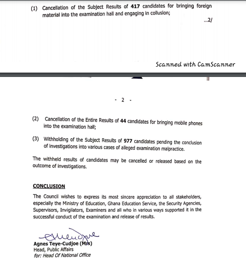 The council further revealed that the subject results of 417 candidates have been cancelled for “bringing foreign materials into the examination hall and engaging in collusion.”