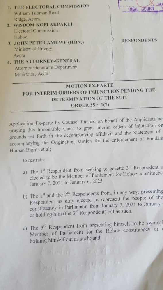 A Ho High Court presided over by Justice George Buadi grants interim injunction restraining the Electoral commission from gazetting John Peter Amewu as Member of Parliament for Hohoe Constituency.