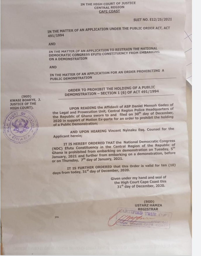 The Cape Coast High Court in the Central Region has placed an interlocutory injunction on the much-anticipated Effutu Constituency demonstration against the Electoral Commission (EC) of Ghana by the opposition National Democratic Congress (NDC) over what they described as a stolen verdict.