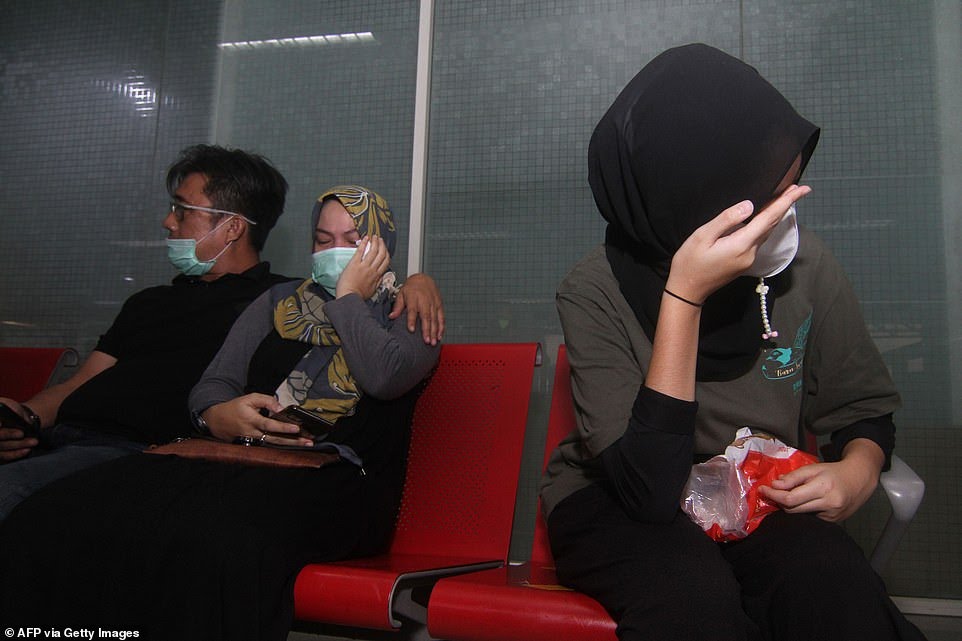Terrified relatives of the 62 people onboard the missing Sriwijaya Air flight wait for news at the Supadio airport in Pontianak – where the plane was expected to land