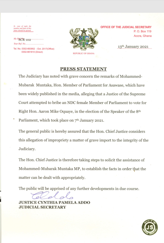 “The general public is hereby assured that the Hon. Chief Justice considers this allegation of impropriety a matter of grave import to the integrity of the Judiciary. The Hon. Chief Justice is therefore taking steps to solicit the assistance of Mohammed-Mubarak Muntaka MP, to establish the facts in order that the matter can be dealt with appropriately,” the Chief Justice indicated statement signed by the Judicial Secretary, Justice Cynthia Pamela Addo.