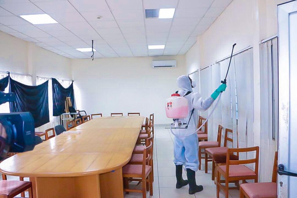 Whereas the offices were disinfected with knapsack sprayers, the environment saw the use of an atomiser.