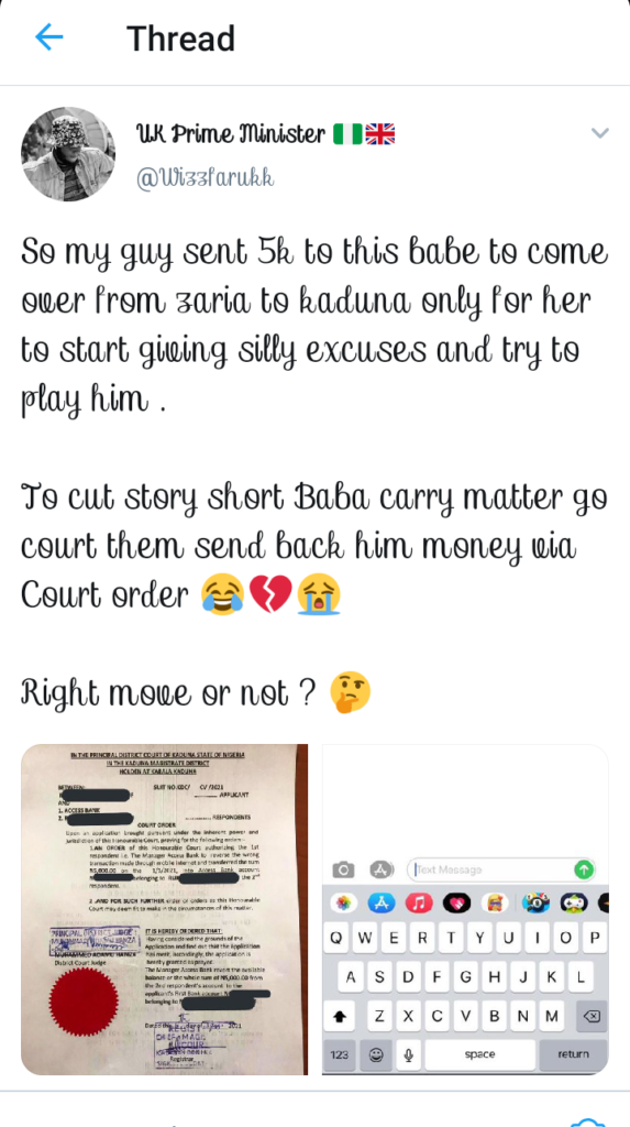 The Nigerian man from Kaduna state dragged the dodgy lady to a district court in the state to retrieve the N5k (GHS76.33).