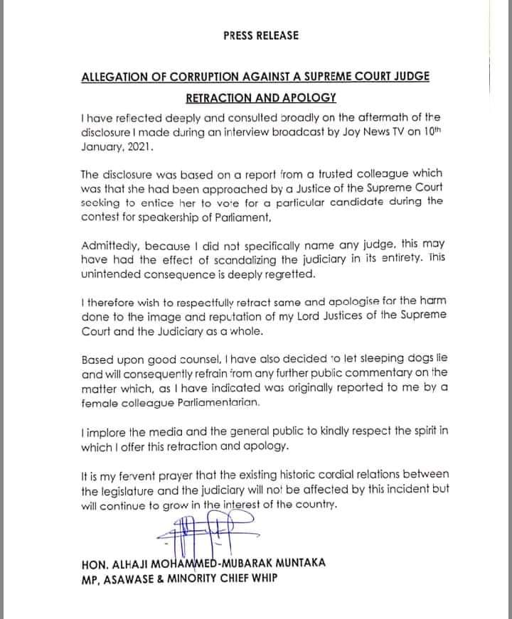The Member of Parliament for Asawase, Mohammed Mubarak Muntaka has apologized for making bribery allegations against a justice of the Supreme Court.