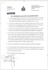 The Ashanti Regional Police Command has asked the public to disregard claims of kidnapping of two girls of St. Louis Junior High School.