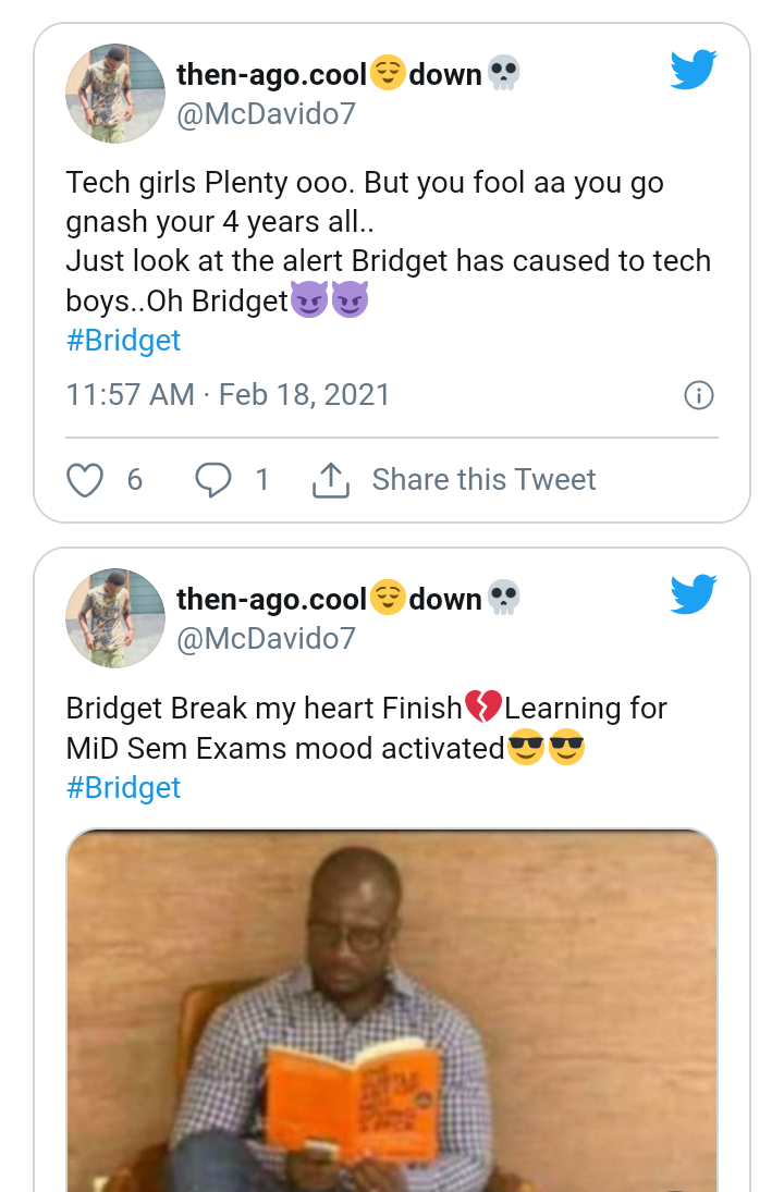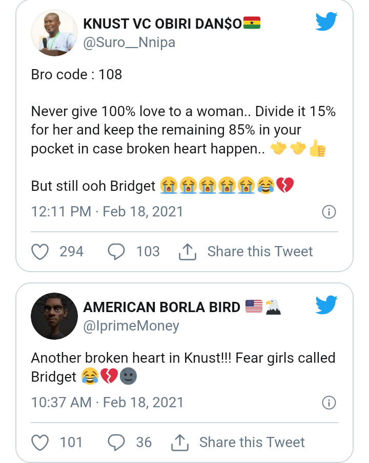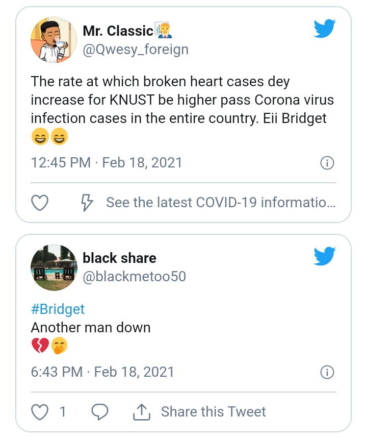 According to some Twitter users, his girlfriend, one Bridget, suddenly ended their relationship.