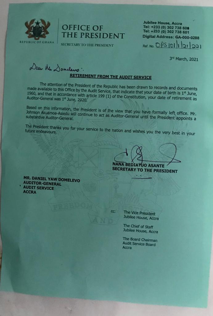 He was, in a letter signed by President Akufo-Addo’s Secretary, asked to proceed on retirement based on an indication by the Audit Service Board that Mr Domelevo has exceeded the eligible age to remain in the workforce.