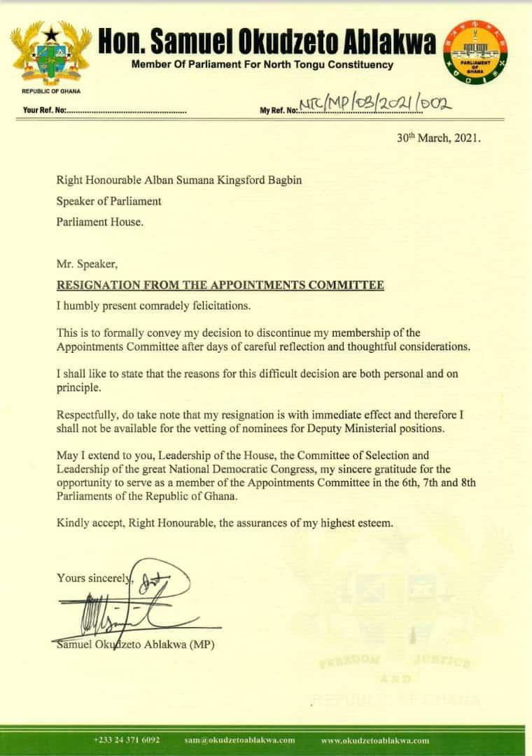 The North Tongu MP, Samuel Okudzeto Ablakwa, has resigned from Parliament’s Appointments Committee.