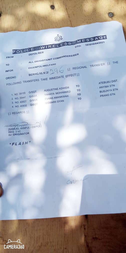 The four Divisional Taskforce officers who made the arrest and refused the bribe have since been handed a suspicious transfer from the Techiman Division to the following stations.