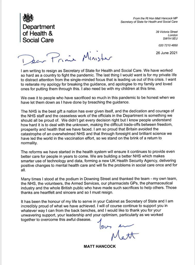 In a letter addressed to the British Prime Minister, Boris Johnson, dated the 26th of June 2021, hon Hancock said he writes to resign as secretary of state for health and social care.
