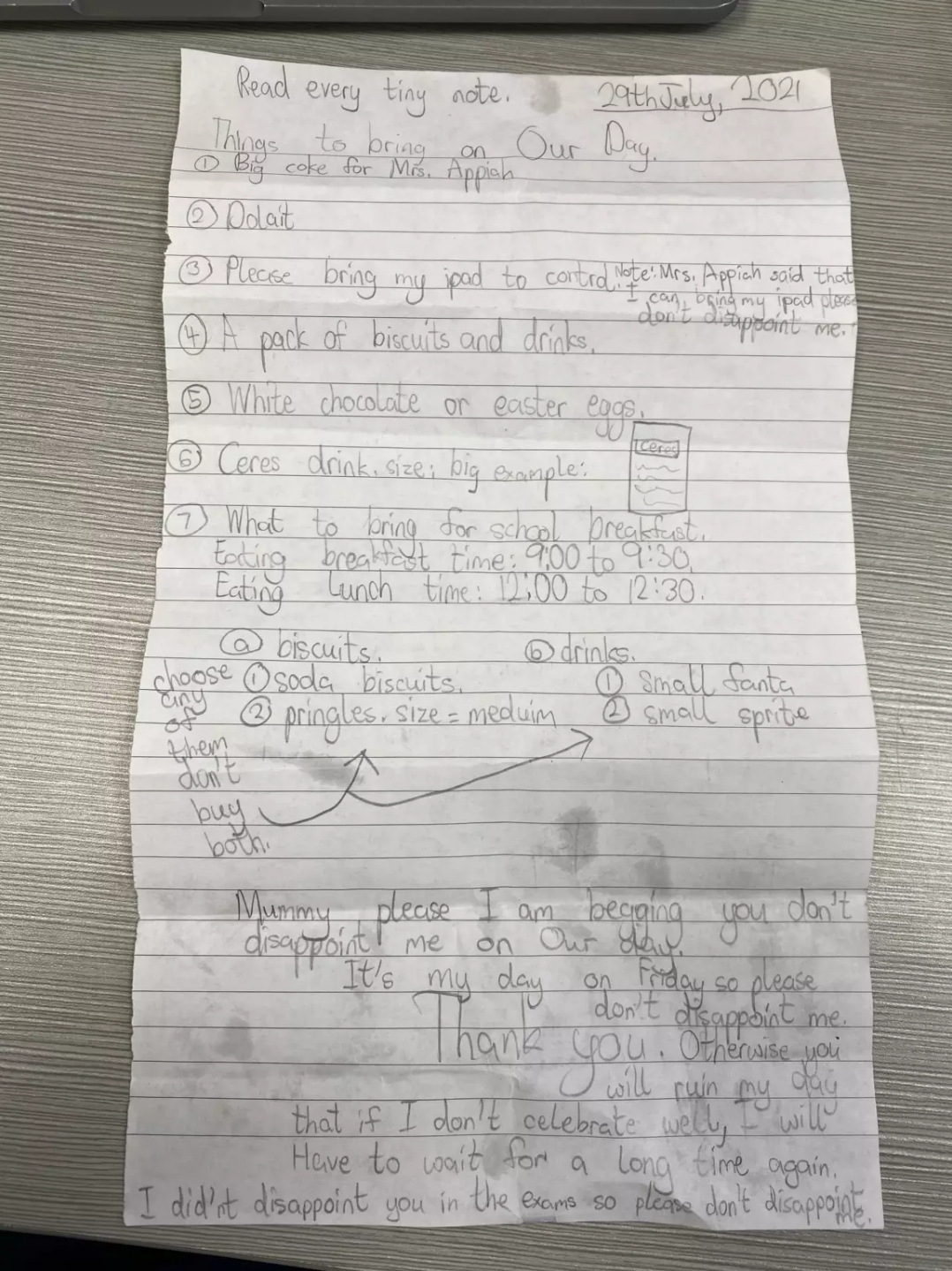 The items aptly detailed by the nine-year-old – with the aid of diagrams – included biscuits, drinks and a communication of a said waiver by his teacher to allow him to use his iPad device in class, just for the occasion.