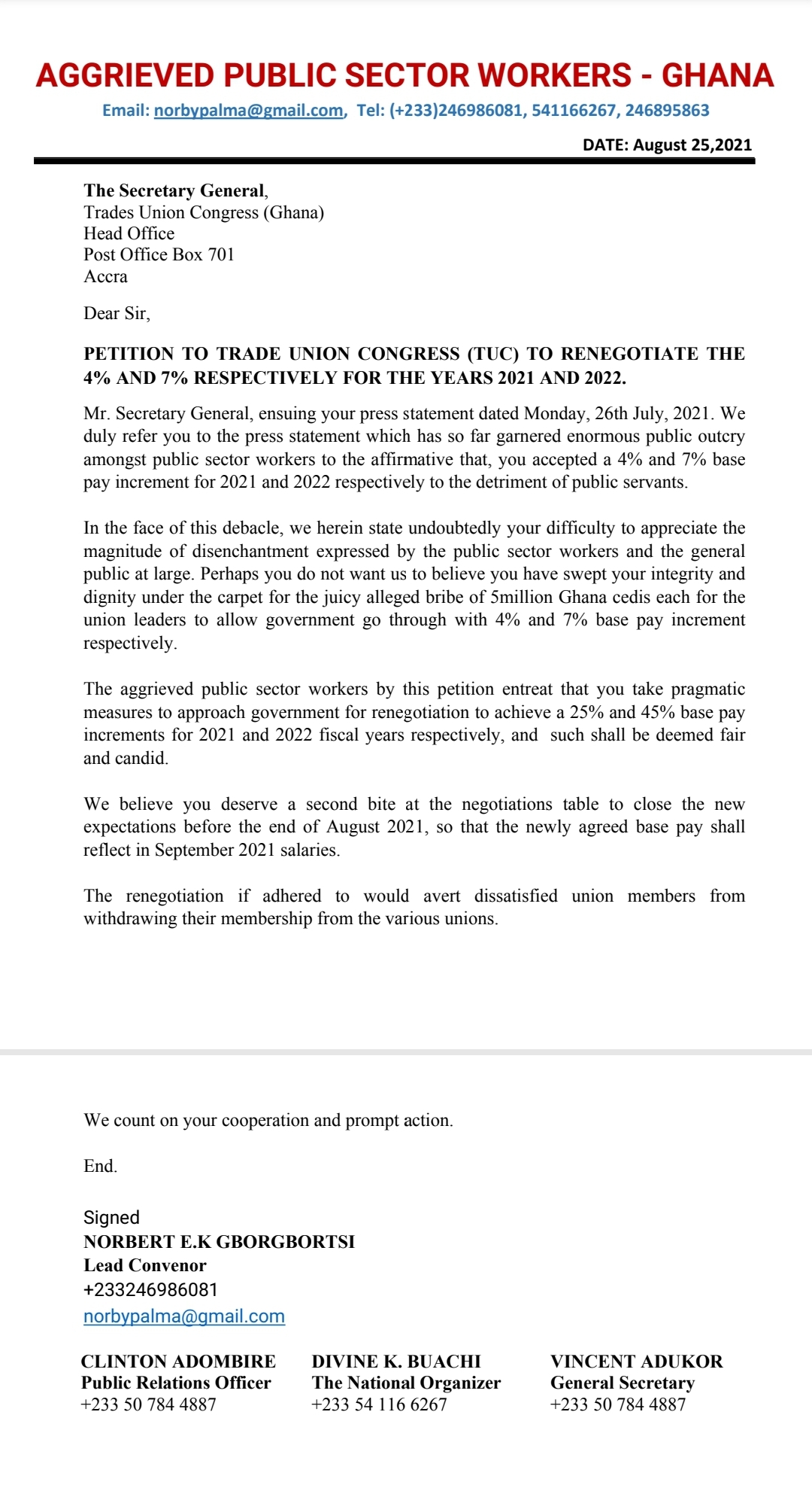 The Aggrieved Public Sector Workers-Ghana has petitioned the TUC’s Secretary General to renegotiate its 2021 and 2022 salary increment with government.