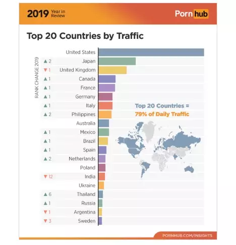 Indeed, the US from the 2019 chart (see below) had more people visiting Pornhub than patrons from the next four highest-ranked countries combined.