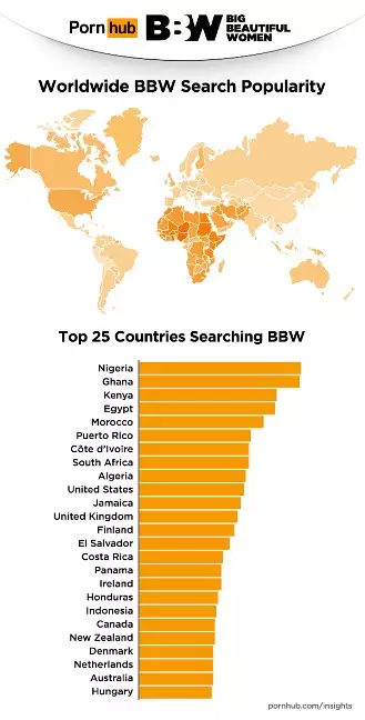 The ranking, done in 2015 by the porn website, stated, “worldwide, it’s still countries from the African continent that proportionately search the most for BBW videos. Again, Nigeria takes the top spot, followed by Ghana, Kenya and Egypt.”