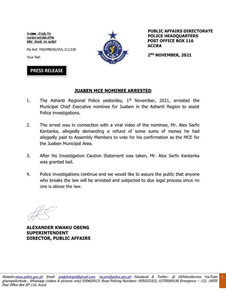 The two-time rejected MCE nominee for the Juaben Municipal Assembly, Alex Sarfo Kantanka has been granted bail after he was arrested by the police for allegedly bribing Assembly members to influence their vote in his favour.
