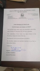 The Ghana Private Road Transport Union (GPRTU) has suspended its nationwide strike which took effect on Monday, December 6, 2021.