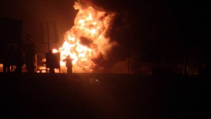 Vehicles of the Ghana National Fire Service can be seen outside the premises.