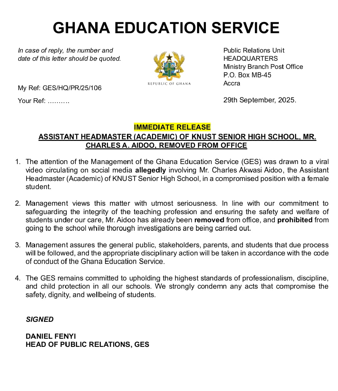 “In line with our commitment to safeguarding the integrity of the teaching profession and ensuring the safety and welfare of students under our care, Mr. Aidoo has already been removed from office, and prohibited from going to the school while thorough investigations are being carried out,” the statement indicated.
